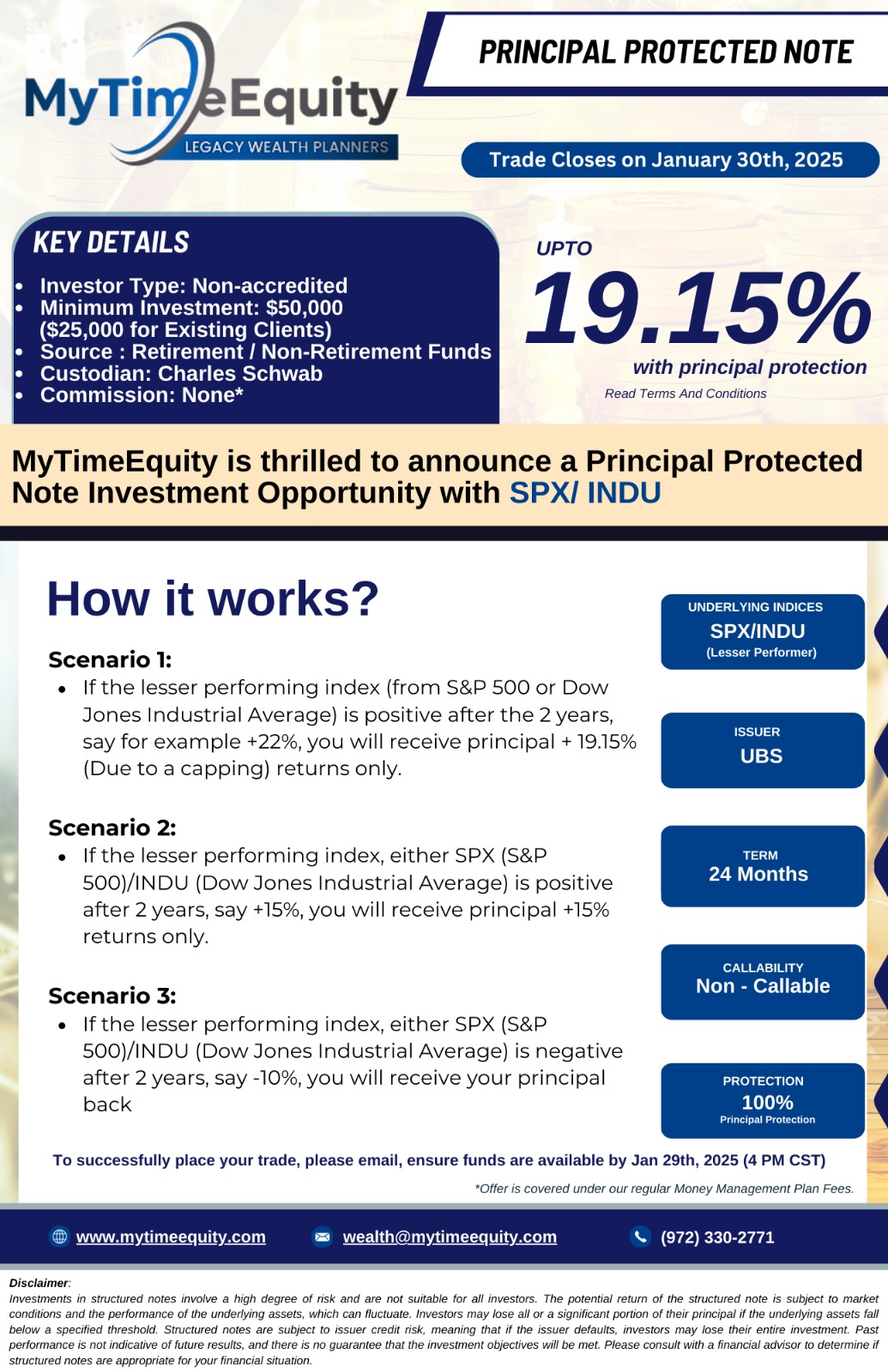 30-Jan-2025 – Principal Protected Note – 2 year growth note with a potential up to 19.15% growth with 100% Principal Protection – S&P 500 (SPX), Dow Jones Industrial Avg (INDU)