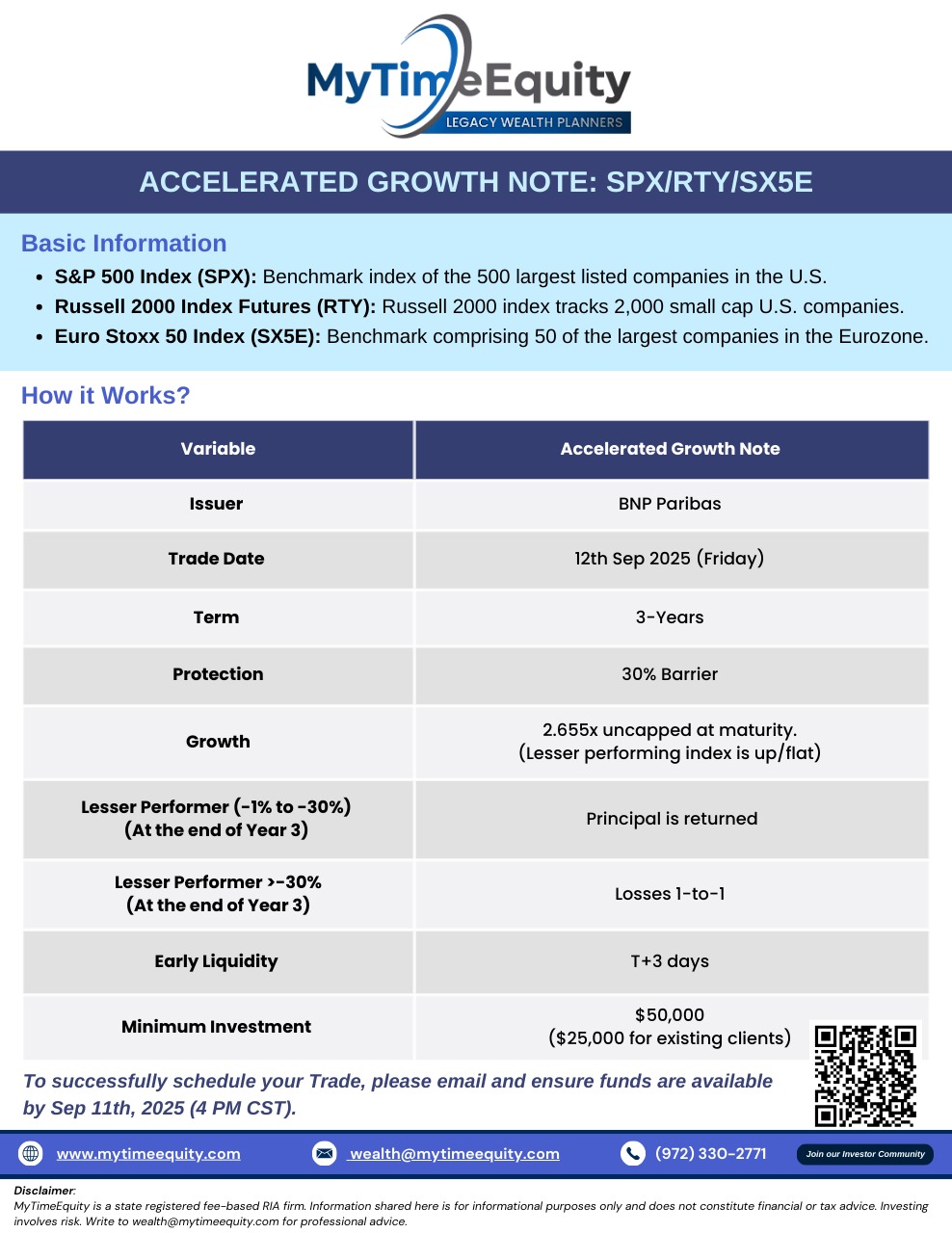12-Sep-2025 – 3 year Index Growth Note – SPX / RTY / SX5E with a potential return of 2.655x return