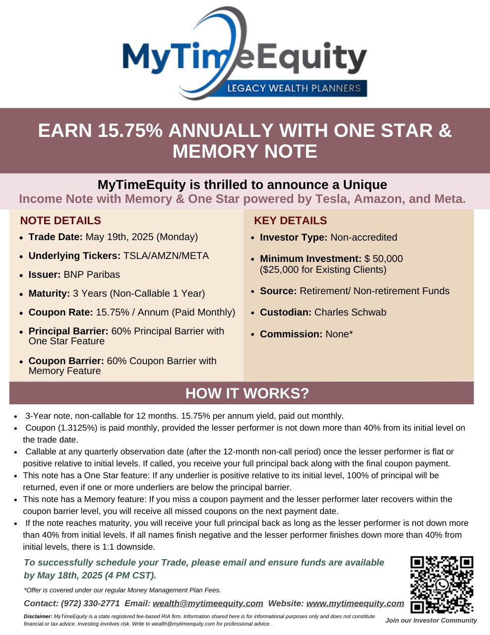 19-May-2025 – Income Note with Memory & One Star- TSLA/AMZN/META – 15.75% PA