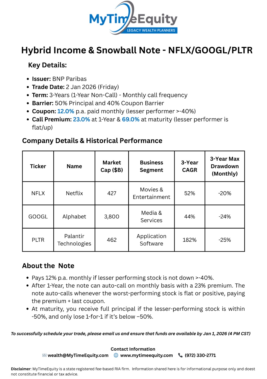 2 Jan 2026 - 3 Year Income and Snowball Hybrid Note - NFLX/GOOGL/PLTR with a potential return of 35% (1 Yr) or 105% (3 Yr)