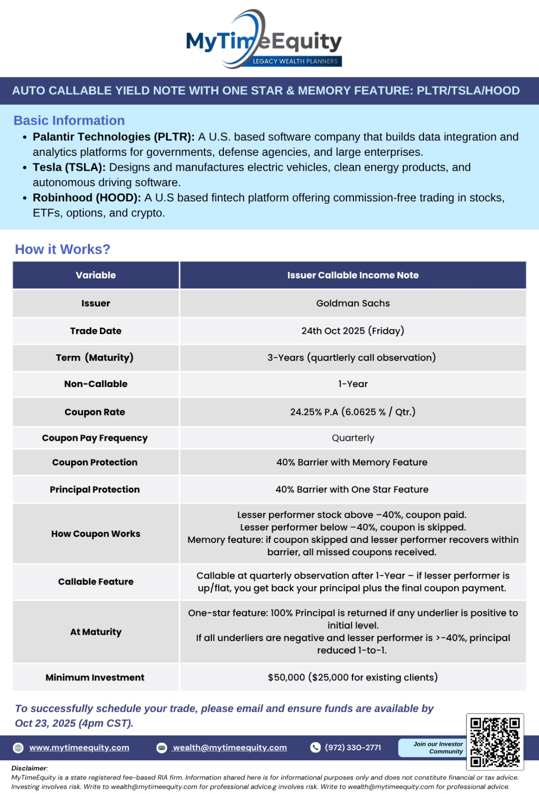 24-Oct-2025- Income Note with Memory & One Star - PLTR / TSLA / HOOD - Potential 24.25% P.A