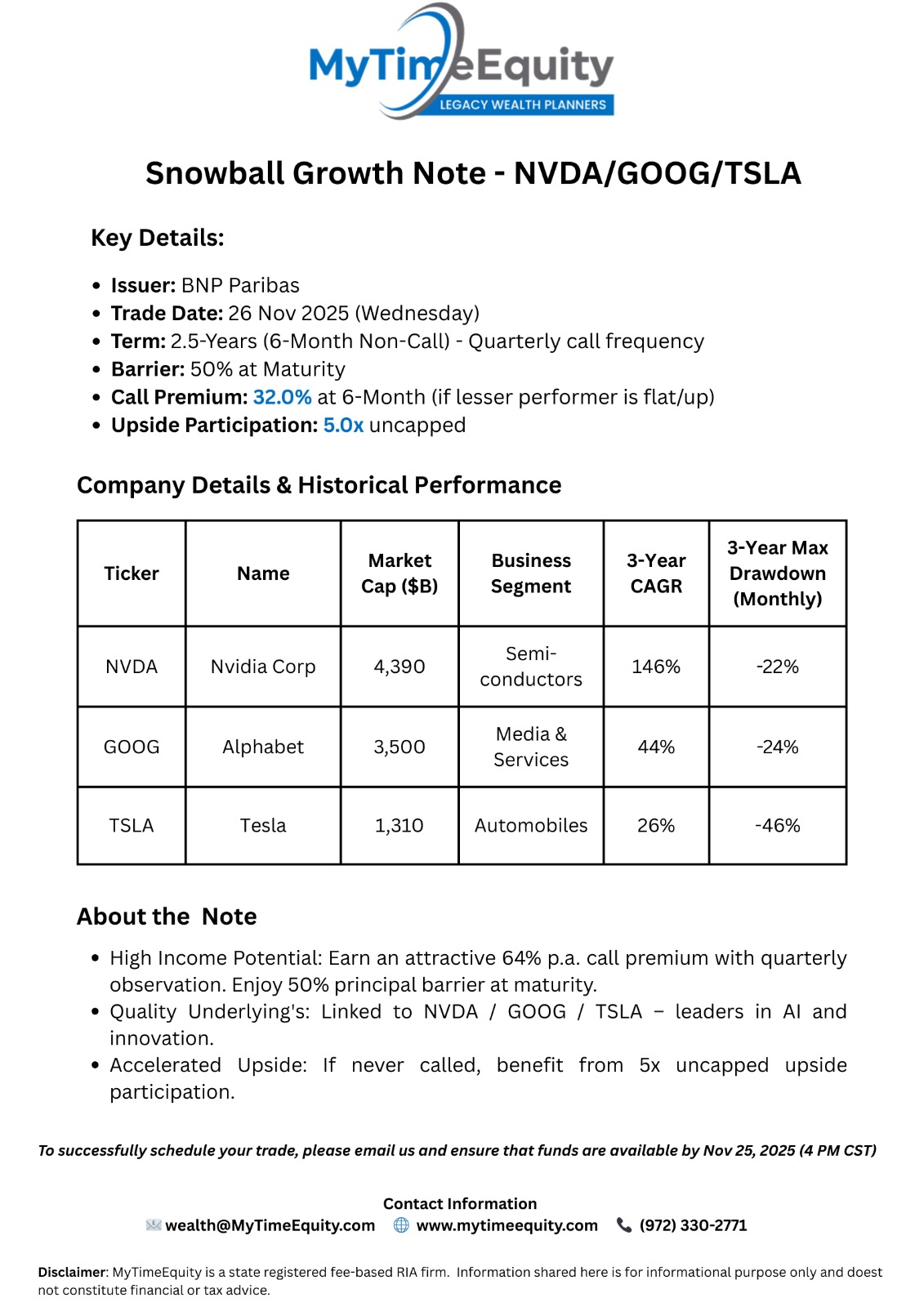 26-Nov-2025 - 2.5Y year Snowball Note - NVDA / GOOGL / TSLA with a potential return of 64% (1 YR) OR 5x (3 YR)