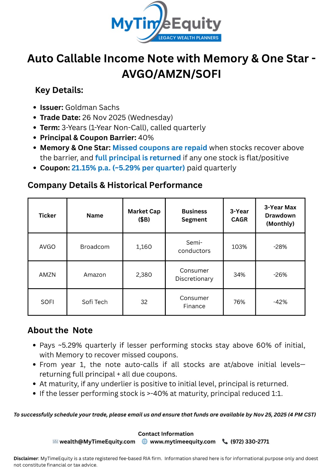 26-Nov-2025- Income Note with Memory & One Star - AVGO / AMZN / SOFI Potential 21.15% P.A